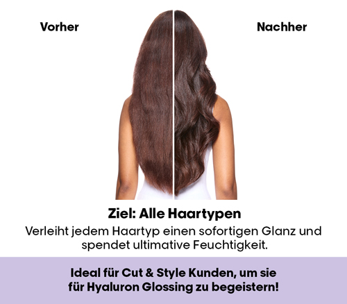 Während klassische Glossings lediglich Farbe auffrischen, setzt das Hyaluron Glossing einen neuen technologischen Maßstab: Die Kombination aus einem 1 % Hyaluronsäure Komplex, einem saurem pH-Wert und einer milchig-cremigen Textur wirkt wie ein hydratisierendes Serum für das Haar, zieht gezielt Feuchtigkeit an, bindet sie tief in der Faser und umhüllt sie zugleich mit einem ultrafeinen Hydrationsfilm. Inspiriert von Hautpflegewirkstoffen entsteht so ein ganzheitliches Pflegeerlebnis, das die Haarstruktur stärkt, intensive Glanzreflexion ermöglicht und eine neue Dimension von Geschmeidigkeit und Hydration eröffnet – für sofort spürbare Resultate und ein gepflegtes, anspruchsvolles Haargefühl.
