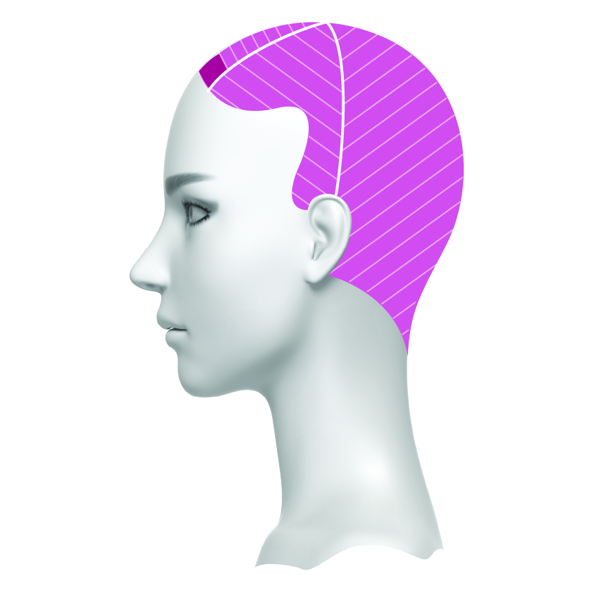 Step 1: Am Oberkopf drei dreieckige Sektionen im vorderen Bereich abteilen.