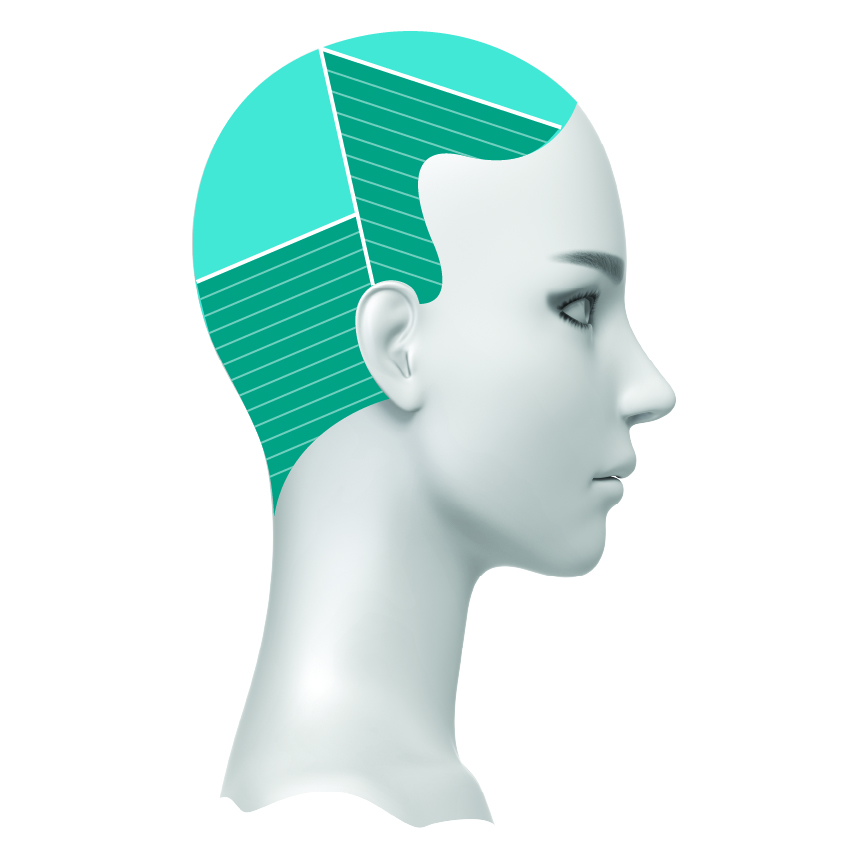 Step 8: Rezeptur 4 auf die vorderen Dreieckssektionen beidseitig am Kopf auftragen und 30 Minuten einwirken lassen.