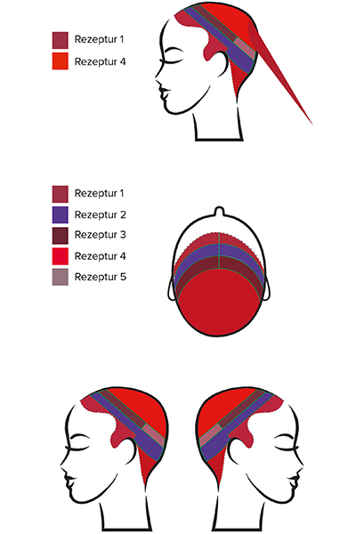 3. Dahinter einen umlaufenden, ca. 2 cm breiten Abschnitt abteilen. Rezeptur 2 vom Ansatz bis in die Spitzen auftragen.