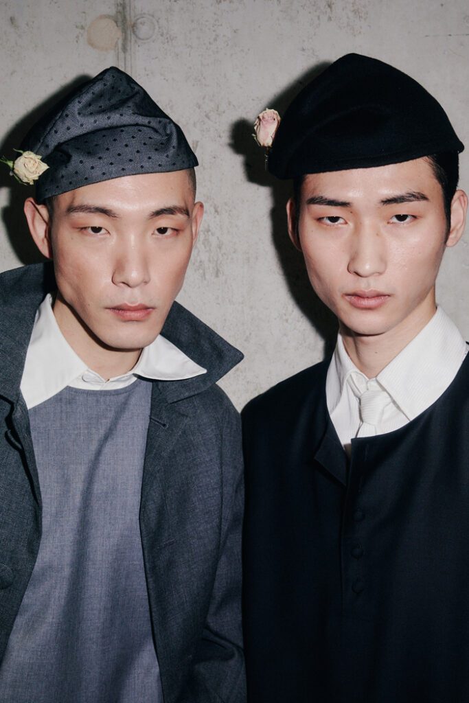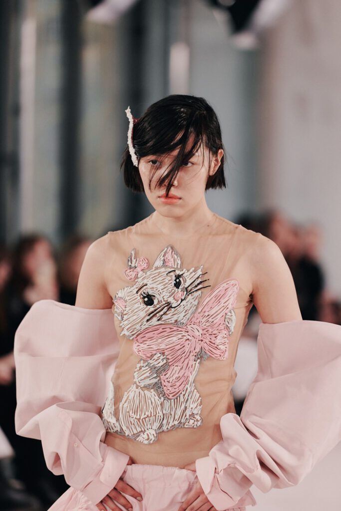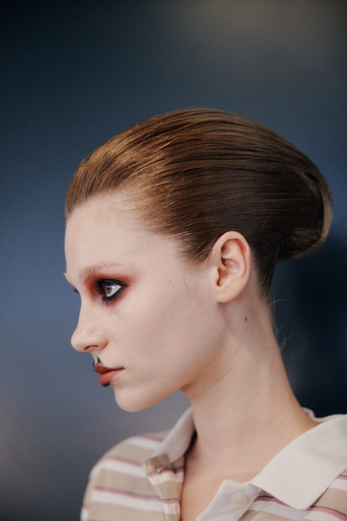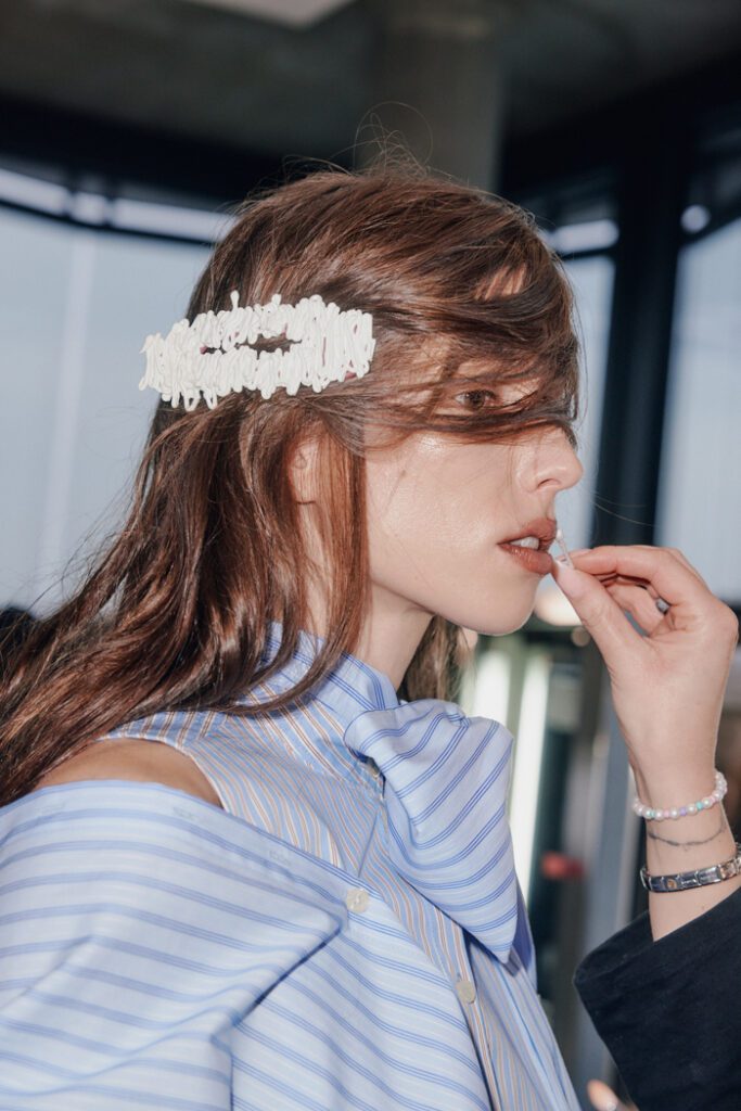 In Bezug auf die Silhouetten wurden Klassiker auf typische Orange Culture-Art neu interpretiert – mit kindlicher Verspieltheit, Eigenwilligkeit und dem charakteristischen androgynen Geist der Marke. Zu den Highlights zählten die Print-Pieces, von Hand bestickte Looks und neu interpretierte klassische Silhouetten. Auch im Haardesign von Alexander Dinter und seinem Team von Stylist:innen spiegelte sich die Vielfalt der Modelle und ihrer individuellen Typen wider.