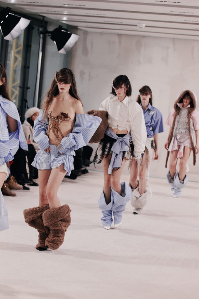Die Silhouetten bewegen sich zwischen Schutz und Entblößung: von umhüllenden Schnitten über Second-Skin-Pieces bis hin zu skulpturalen Volumen, die dennoch körpernah anlagen. Messy, rau und ungemacht zeigten sich die Hairstyles, die Alexander Dinter und sein Team passend zur Mode von Kasha entwarfen.