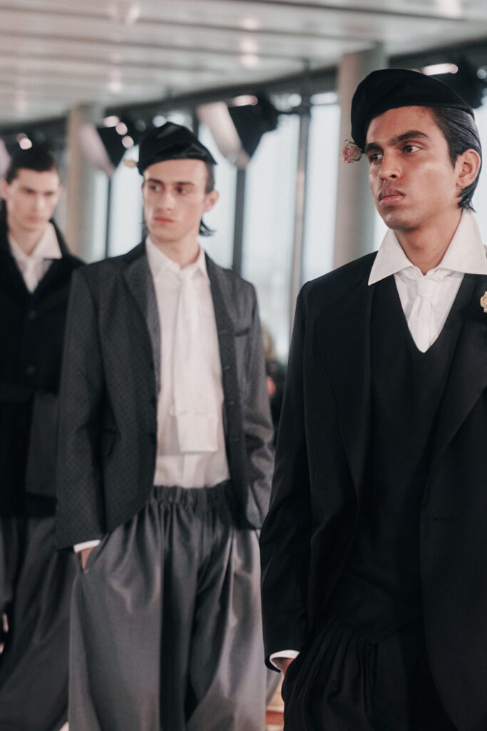 Interessant waren auch seine Spiele mit Volumen, mit matten und glänzenden Materialien sowie luxuriösen Stoffen. Insgesamt kontrastierte die Kollektion strenge, einheitliche Silhouetten von Businesskleidung mit historisch inspirierten Materialien und Farben und legte die Spannung zwischen „Wissen“ und „Glauben”, Humanismus und Gier, Aufklärung und Überschwang, Individualität und Uniformität offen.