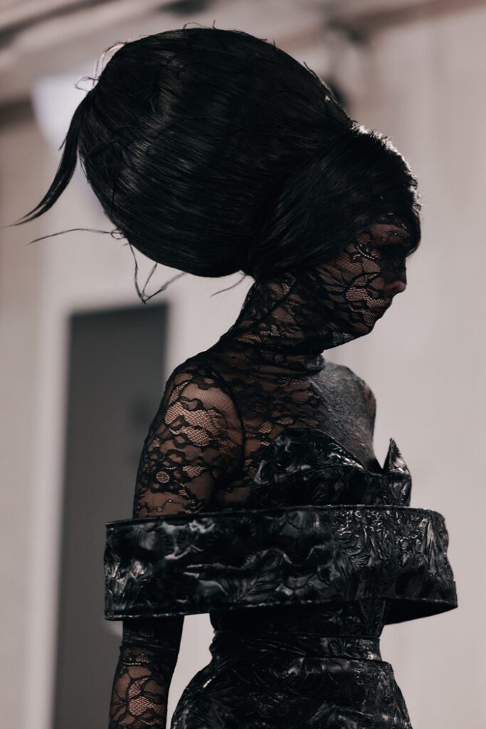 Hanischs mystische Entwürfe beeindruckten mit skulpturalen Formen, Korsetts, Fake-Hörnern und -Federn, mit viel veganem Leder und strukturierten Oberflächen. Inspiriert von der Opulenz der Formen gestaltete Alexander Dinter avantgardistische Hairdesigns voller Handwerkskunst. Sein erster, aufwändiger Look setzte die Handschrift des Designers in Form eines skulptural gestalteten Dutts fort.
