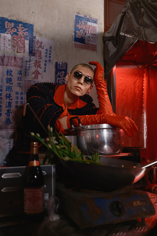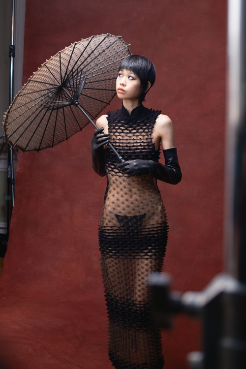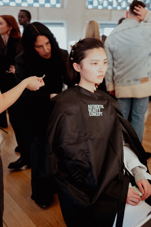 „Ausgangspunkt für die Hair Looks war die Ästhetik der Peking-Oper und ihre ausdrucksstarken Kopfbedeckungen. In der Oper erzeugen die Federn diese wunderschönen, kalligrafischen Linien, die die Bewegung der Performer verlängern. Wir wollten das auf eine puristische, moderne Art neu interpretieren: ultraglattes, spiegelndes Haar als Statement von Eleganz, akzentuiert durch skulpturale Details. Das Glow Spray Serum von AUTHENTIC BEAUTY CONCEPT war dabei zentral für den intensiven, glasartigen Shine“, erklärt Anna Cofone.