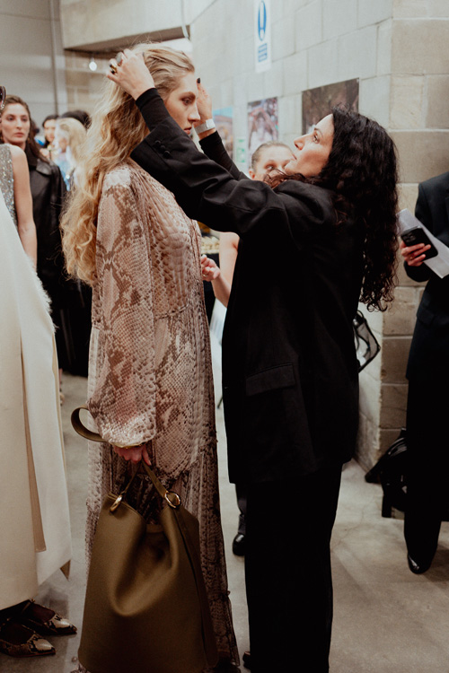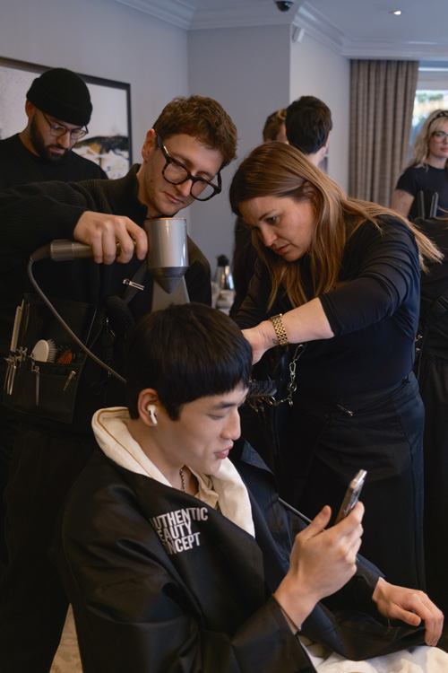 Das Haar sollte sich intuitiv, easy gestylt und zugleich modern anfühlen. Das Ergebnis war eine zurückgenommene, leichte Silhouette: nie streng gescheitelt, nie übermäßig präzise, sondern authentisch und natürlich. Es wirkte, als sei es bereits vor einigen Tagen gestylt worden – soft, selbstverständlich und selbstbewusst.
