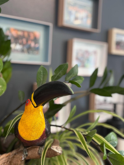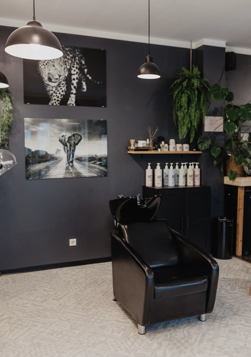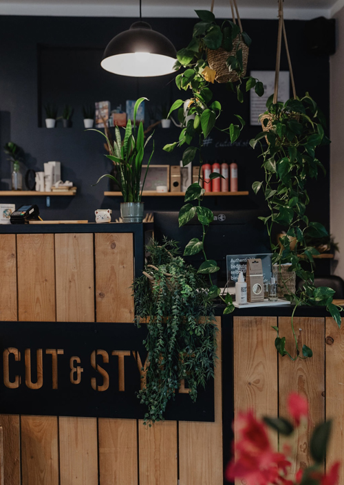 Beim Betreten des Salons spürt man sofort die besondere Stimmung: warm, lebendig, authentisch. Viele Pflanzen, erdige Töne, tiefes Grün und Schwarz schaffen ein warmes, ruhiges Gesamtbild. Die Arbeitsplätze wurden in Zusammenarbeit mit einer örtlichen Schreinerei individuell aus Holz gefertigt. Liebevoll ausgewählte Dekoration, darunter großformatige Tiermotive aus Afrika, ein auffälliger Papagei und besondere Vasen an einzelnen Plätzen, unterstreichen das Gefühl eines wohnlichen, persönlichen Raums. Cut & Style Hairdesign wirkt bewusst nicht steril, sondern einladend, lebendig und nahbar.