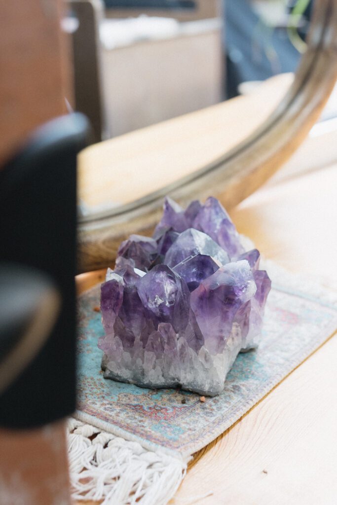 Das Interior ist entsprechend individuell. Viele Möbel wurden durch Upcycling neu aufgebaut, andere stammen von Reisen. Holz, warme Erdtöne und über zwanzig Pflanzen schaffen eine natürliche Atmosphäre. Ergänzt wird das Ganze durch kleine Details – von handverlesener Dekoration bis zu Edelsteinen.