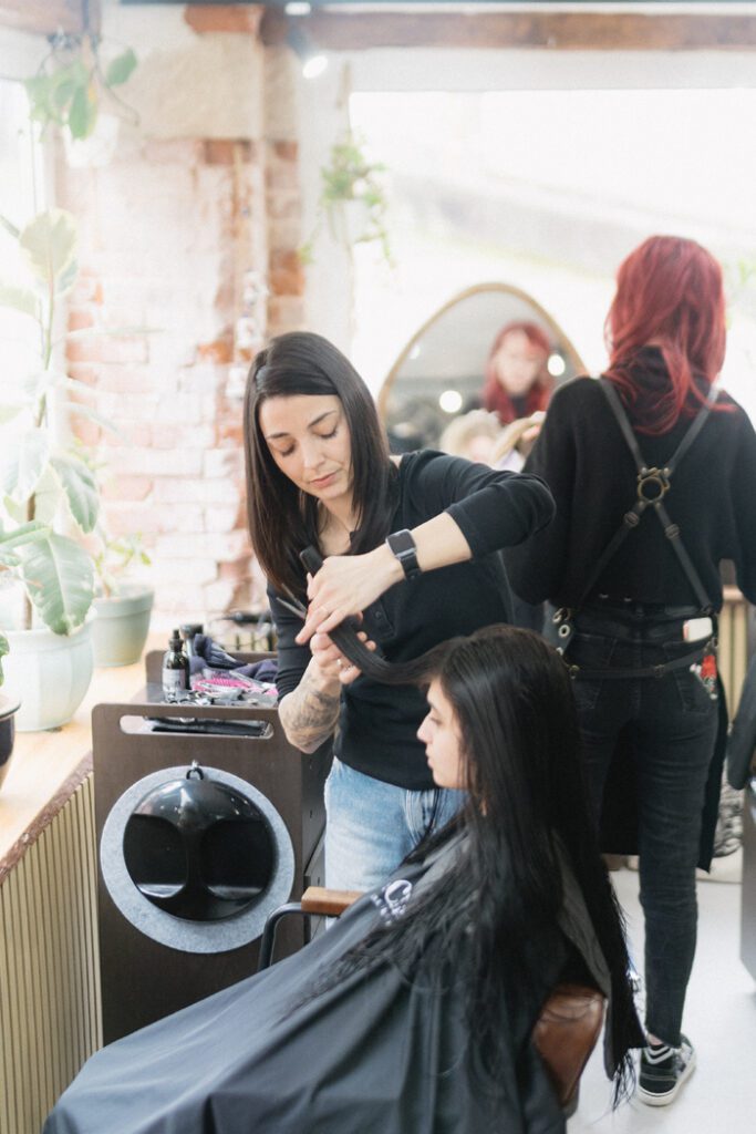 Auch im Team setzt Haare Schee auf eine klare Haltung: Zusammenarbeit statt Konkurrenz. Hier gibt es keine klassischen Hierarchien. Jede Person bringt ihren eigenen Stil ein, gleichzeitig unterstützt man sich im Alltag selbstverständlich – sei es beim Vorbereiten von Farben, beim Aufräumen eines Platzes oder bei der Betreuung der Gäste.
