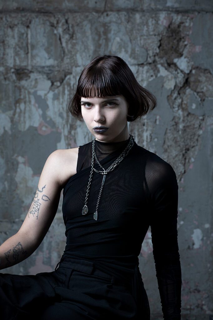 Ein kurzer Bob mit klarer Linienführung, betont durch eine selbstbewusste Kopfhaltung. Die Kontur wird in feiner Piquetage-Technik geschnitten, das Innere in tiefem Piquetage gearbeitet – ideal für wandelbare Stylings. Hier gestylt im Wet-Look: Flachgelegte Ansätze und eine übertrieben gerundete Linie bringen den Ausdruck auf den Punkt.