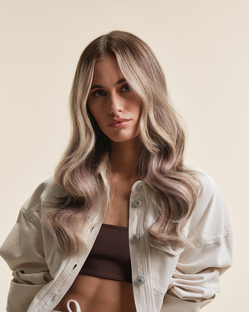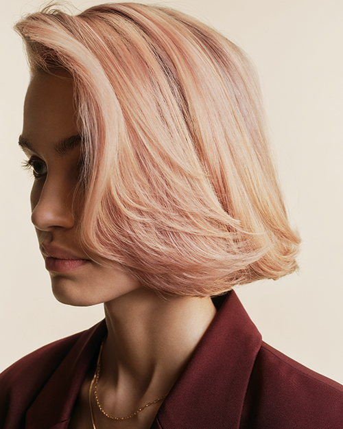 Ein feiner Mix aus Apricot, Rosé und hellem Beige, der dem Blond eine modische, dennoch alltagstaugliche Note verleiht.Der Look bringt Wärme ins Haar, bleibt aber leicht und transparent – ein subtiler Akzent, der das Styling ergänzt, ohne dominant zu wirken.